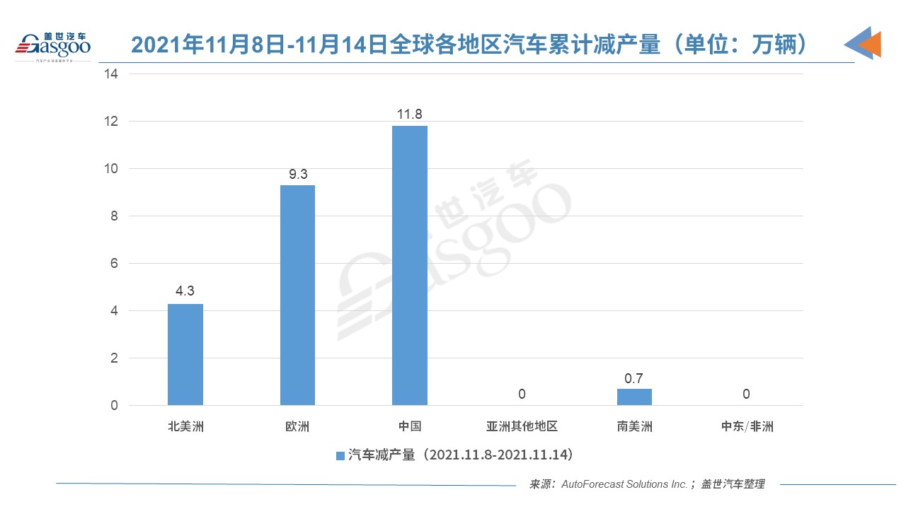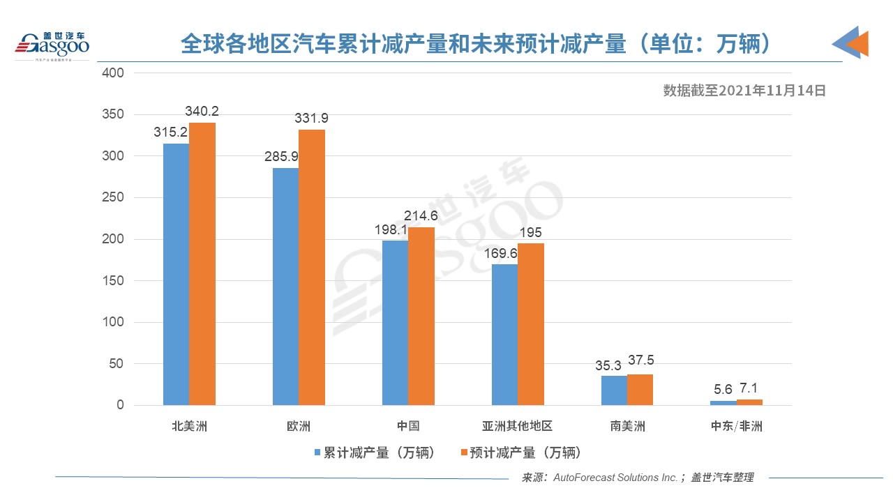 车圈引力波讯 据外媒报道,根据AutoForecast Solutions(以下简称为AFS)的最新数据,截至11月14日,由于芯片短缺,今年全球汽车市场累计减产量已破千万大关,至1009.7万辆,比前一周增加了约26万辆。其中,中国汽车市场累计减产量已达198.1万辆,占总减产量的19.6%。AFS预计,今年全球汽车市场累计减产量会攀升至1126.3万辆。