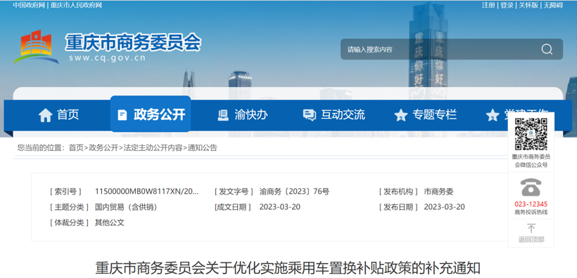 3月21日消息,重庆市商务委员会于近日发布了《关于优化实施乘用车置换补贴政策的补充通知》(以下简称为“《通知》”)宣布,对当前正在实施的新能源乘用车置换补贴政策进行优化调整。