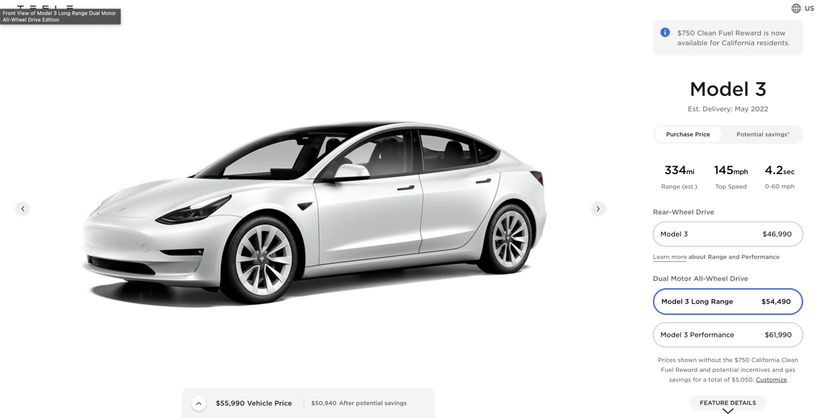 特斯拉网站显示,该公司提高了其在美国的所有车型的价格,目前其最便宜车型Model 3起价约为4.7万美元(约29.95万元)。特斯拉最便宜的车型Model 3后轮驱动版上涨了2,000美元,至46,990美元;Model 3双电机全轮驱动版的价格上涨了2,500美元,至54,490美元;Model 3高性能版也大幅增加了3,000美元,至61,990美元。据悉,上周,特斯拉就将Model 3双电机全轮驱动版的价格上调了1,000美元。