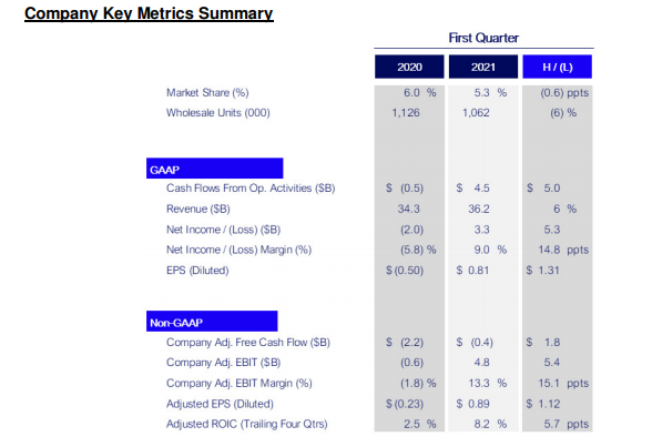 根据Refinitiv IBES的数据,这家美国第二大汽车制造商轻松击败了华尔街对该公司的盈利预期,每股盈利81美分,而市场对其的普遍预期为每股盈利21美分。去年第一季度,该公司每股亏损50美分。