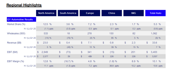 福特一季度各地区财务表现(图片来源:福特汽车)
