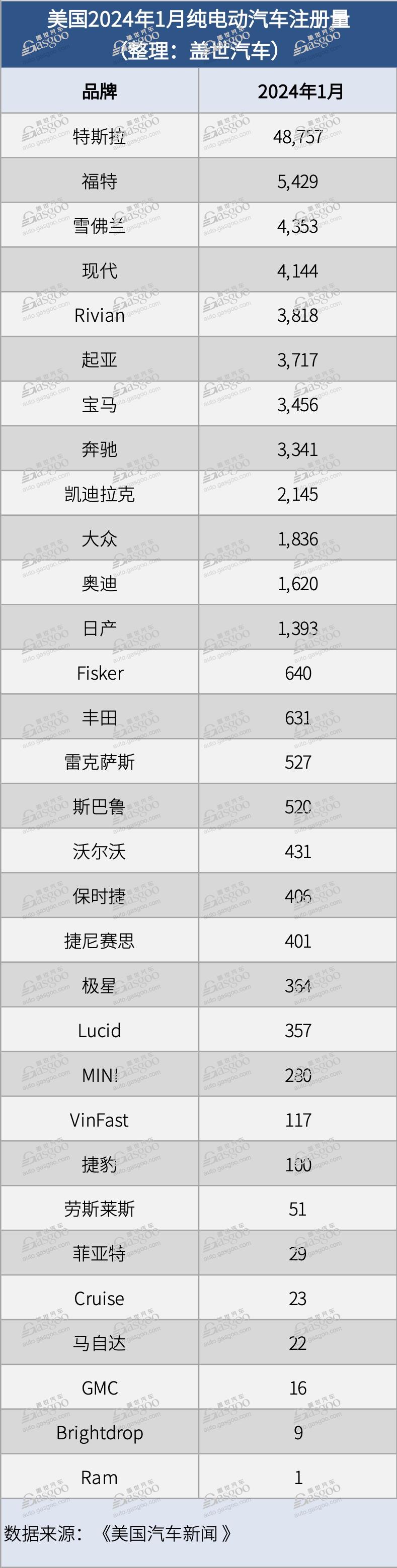 美国2024年1月份纯电动汽车注册量:涨幅放缓