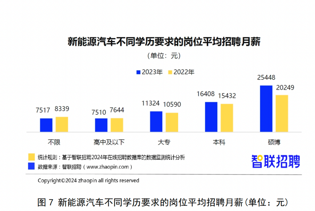 某车企员工指出,技术研发岗位更青睐高学历人才。但对于其他岗位,并非完全是以“学历论英雄”。毕竟,高学历也意味着更高的人力成本。值得注意的是,新能源汽车行业的薪资与学历呈正相关,硕博学历招聘岗位2023年平均薪酬高达25448元/月,较上一年增长26%。