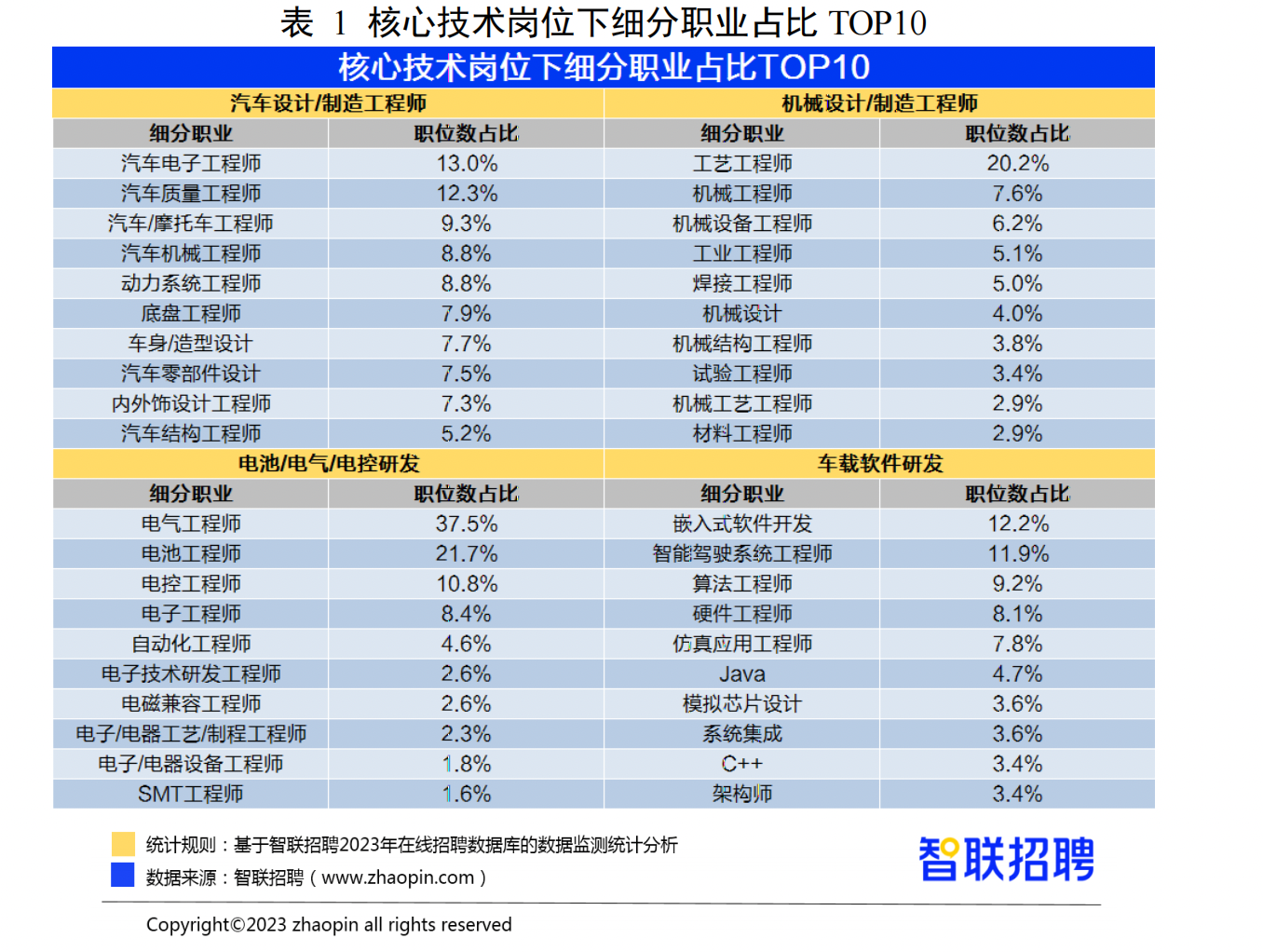 《2023 年新能源汽车人才发展报告》(以下简称报告)显示,2023 年新能源汽车招聘需求总体增长 32%,增幅就主要集中于三电和软件等技术类岗位。