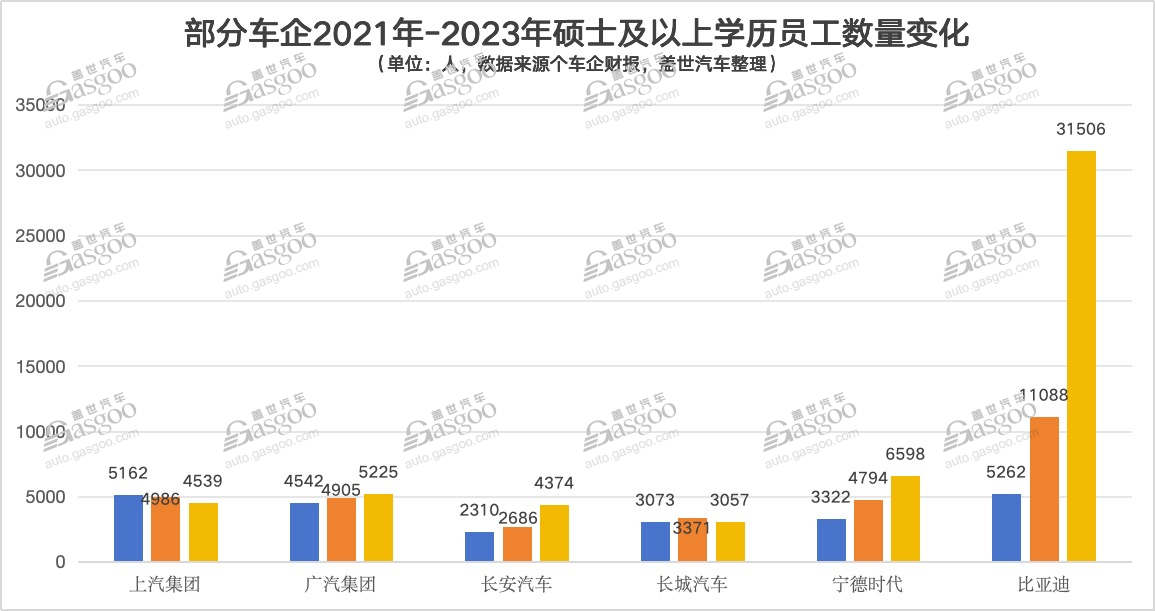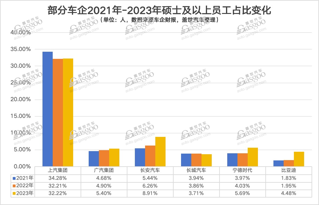 然而,一个显著的趋势是多家车企提高了研究生岗位的占比。车圈引力波对6家上市车企的调查显示,除上汽集团和长城汽车外,其他四家车企的研究生员工人数明显增加。特别是比亚迪,去年研究生员工人数达3.2万人,占比提升至4.5%。但是,这个增幅明显低于硕博工作获得率的降幅。
