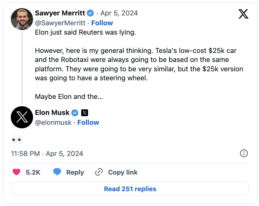 另一位知情人士也证实了特斯拉取消了平价车计划,并表示新的计划要求生产无人驾驶出租车,但产量预计要远低于对Model 2的预期。