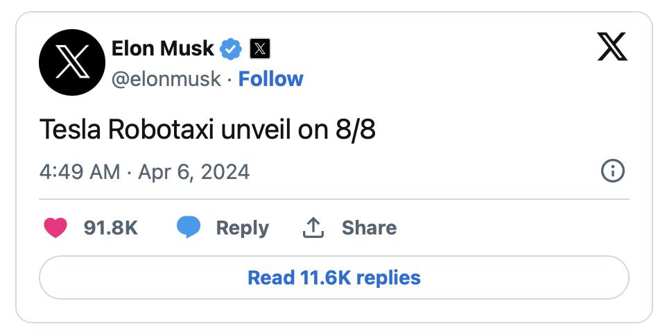 对此,特斯拉没有回应置评请求;马斯克则在社交媒体平台X上写道,“路透社(又)在撒谎。”但他没有提供具体细节。不久后,马斯克在X上发帖称,特斯拉将于8月8日推出无人驾驶出租车。