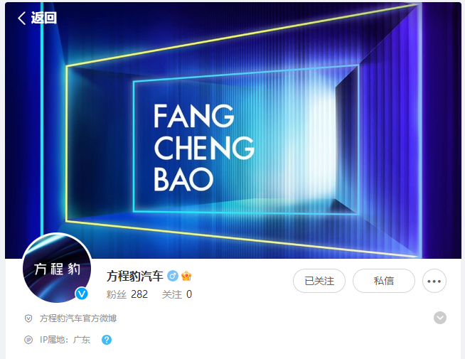6月6日,车圈引力波翻阅公众平台获悉,一个IP属地位于广东的名为“方程豹汽车”的认证微博现身。