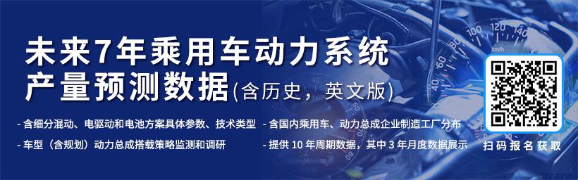 《未来7年乘用车动力系统产量预测数据》(含历史,英文版):细分混动、电驱动和电池方案具体参数、技术类型;车型(含规划)动力总成搭载策略监测和调研;国内乘用车、动力总成企业制造工厂分布;提供10年周期数据,其中3年月度数据展示;附赠季度预测分析报告等。获取方式如下:
