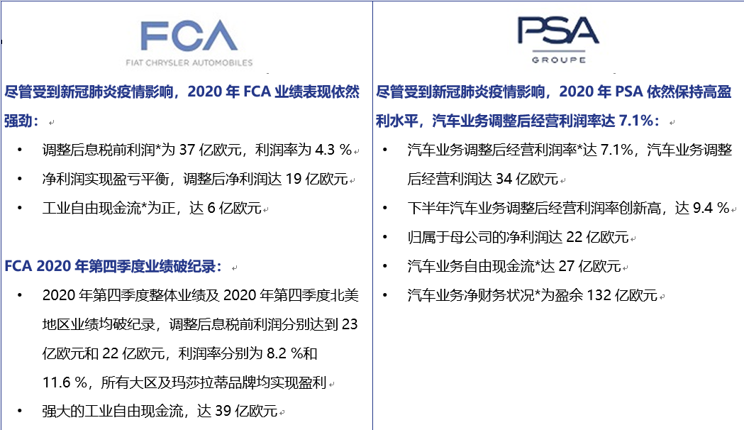 2021年1月16日,PSA集团(PSA)与菲亚特克莱斯勒汽车公司(FCA)的跨境合并交易正式完成,双方从而合并成为一家全新的集团:Stellantis。以下内容为FCA与PSA合并完成前,截至2020年12月31日,双方各自于2020年实现的财务业绩。
