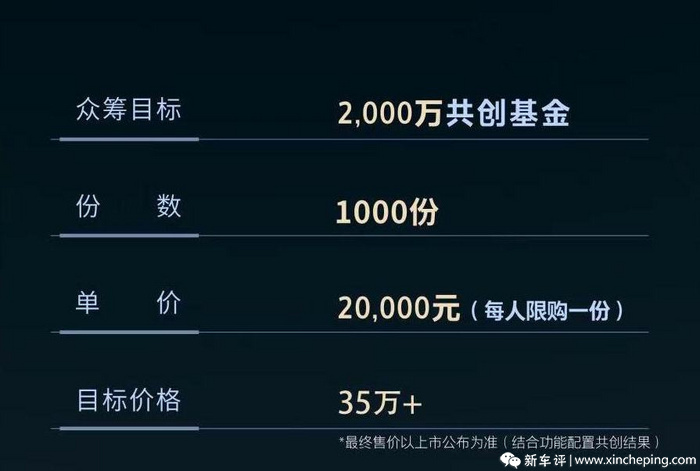 该项目众筹周期从3月30日20点至4月30日20点,为期一个月,如果项目顺利达到众筹目标,将在4月份启动项目立项,并预计2024年第二季度完成项目开发。此外,众筹用户将成为合伙人,享受尝鲜权、共创权、膨胀权、闪耀权、收获权等五项权益。其中在膨胀权方面,可以享受20000元共创基金抵扣40000元购车款,换言之参加共创的用户,可以直接享受20000元的购车优惠。
