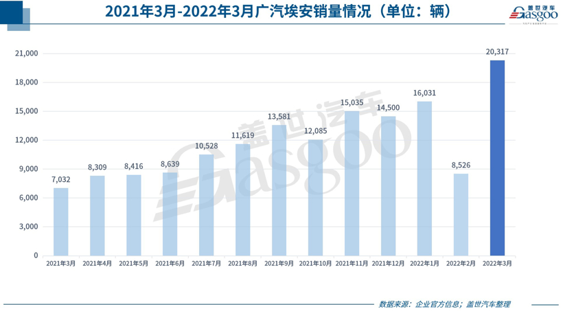 4月1日晚,广汽埃安发布3月销量数据。数据显示,广汽埃安3月销售新车20,317辆,同比增长189%。