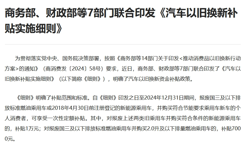 不过,以旧换新补贴政策的持续推动下,依然会给车市带来一定放量。除了地方政策陆续落实外,各大车企同步响应,结合政策推出了各种优惠。据相关统计,目前已有奔驰、宝马、奥迪、一汽-大众、一汽丰田、东风日产、比亚迪、长安汽车、吉利汽车、蔚来、小鹏等品牌先后宣布,在政府补贴之外叠加推出品牌方的优惠,以承接住这一波以旧换新释放的市场红利。
