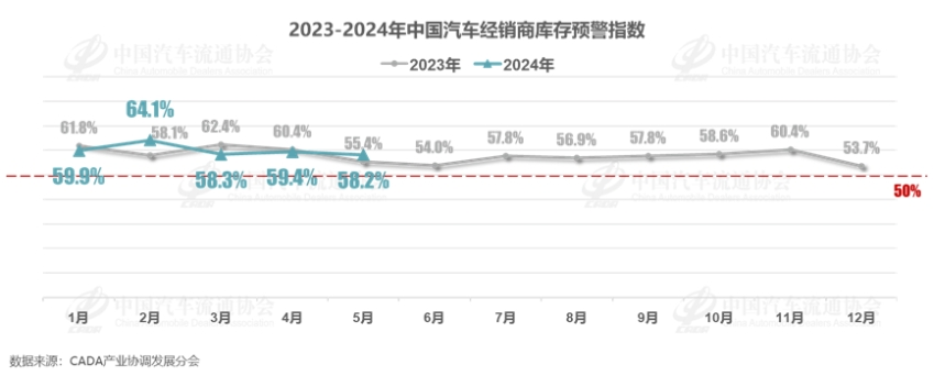 日前,中国汽车流通协会发布最新一期“中国汽车经销商库存预警指数调查”显示,2024年5月中国汽车经销商库存预警指数为58.2%,同比上升2.8个百分点,环比下降1.2个百分点。由此推断,5月汽车销量相较去年依旧有所下滑,不过环比上月或有好转。