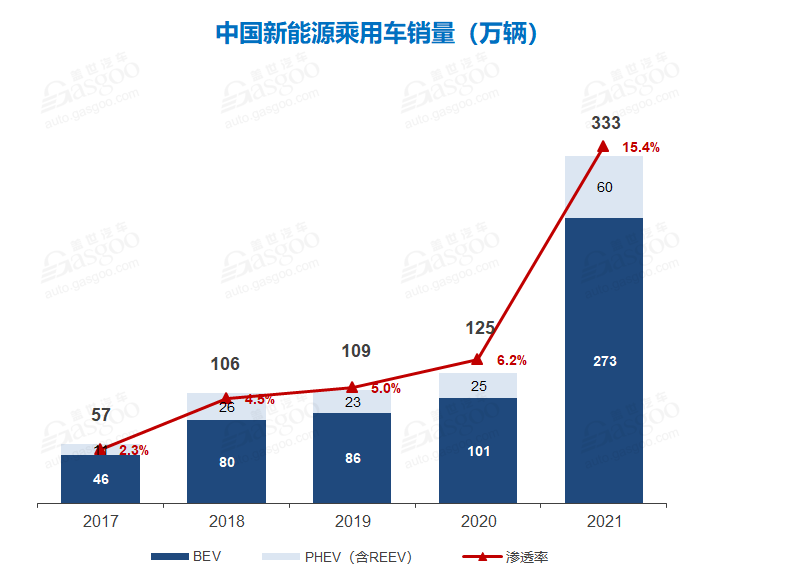 近五年中国新能源乘用车销量及渗透率 数据来源:中汽协,车圈引力波研究院分析整理