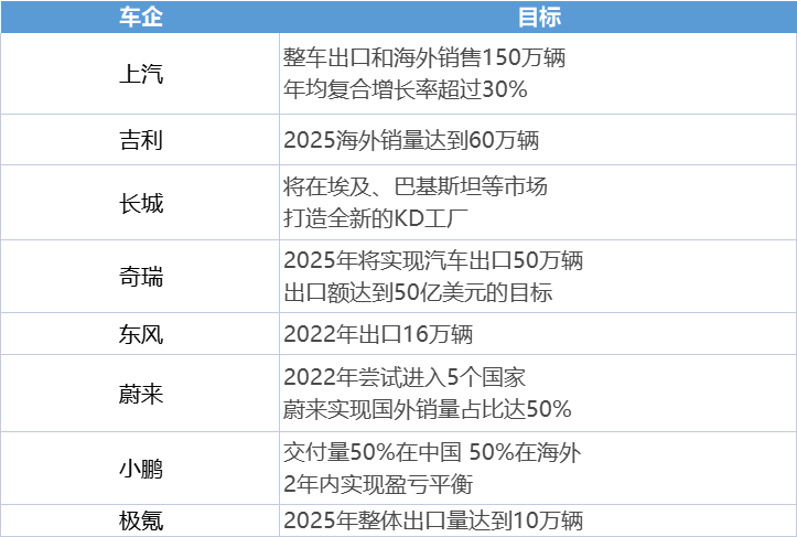 2017年底,奇瑞发布"WWW+计划,宣布开启奇瑞智能化新时代的全球市场战略。2018年,吉利表示将在海外出口上将有重大变化;长安宣布调整出海战略,扎根第三世界并筹备进军欧美市场;东风集团宣布海外中期事业计划,2020年海外销量达15万,产品进入欧美市场的目标。2019年,长城汽车宣告开启全球化战略元年。