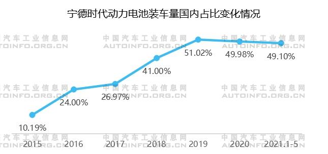 宁德时代市占率稳步提升,稳坐动力电池装机量头把交椅。2021年1-5月,宁德时代动力电池装机量达20.32GWh,市占率49.10%。