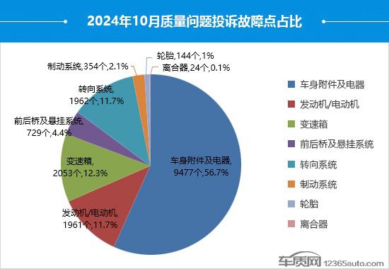据国内领先的缺陷汽车产品信息收集平台车质网统计,2024年10月车质网共受理车主有效投诉信息13,395宗(其中含第三方平台投诉16宗),环比上涨3.9%,同比下降18.5%。今年前10个月累计投诉量已突破14万宗,超过2022年全年投诉量总和。