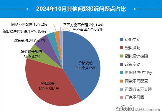 进入10月,“价格变动”再次成为占比最高的投诉问题点,较9月份提高了3.7个百分点,与“疑似减配”形成两强割据的局面,两者占比之和接近总量的8成。