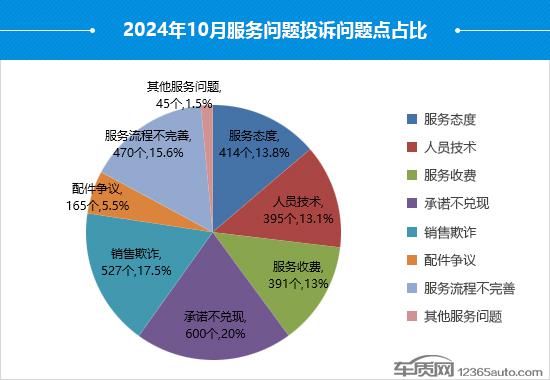 本月服务问题的格局与上月基本保持一致,承诺不兑现取代销售欺诈成为占比最高的服务问题,较9月份提高了2.1个百分点。投诉问题点在“销售承诺不兑现”,投诉多来自于部分自主品牌新能源车型。此外,服务收费的投诉问题点环比也出现了明显提升,较上个月增长25.3%,具体投诉问题点为“定(订)金纠纷”。