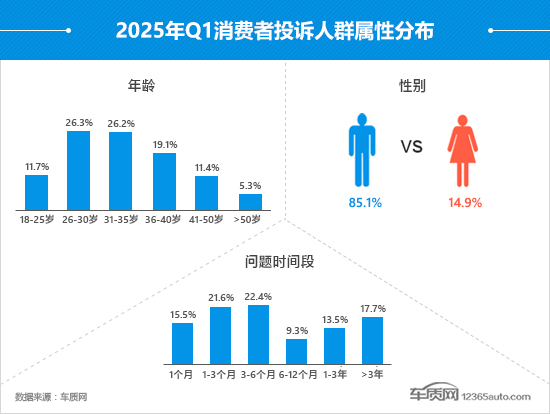 从性别占比情况来看,男性消费者的占比持续降低,侧面也反映出女性消费者的维权意识和积极性在不断提升。从投诉人群年龄段来看,26-35岁依旧是投诉主力人群,占比超过一半,但与上季度相比略有下降。此外,18-25岁的年轻消费人群占比有所提升。值得注意的是,本季度购车6个月内出现问题的投诉占比激增,较2024年四季度提高了29个百分点,接近总量的6成,新车阶段出现问题的概率在增加。