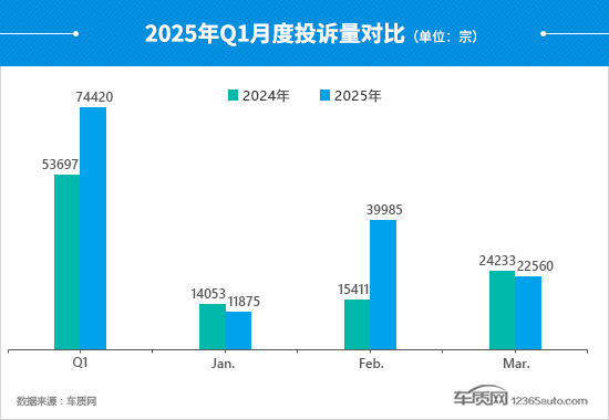 受部分车型爆发阶段性集中投诉影响,2025年一季度的投诉量出现了跨越式增长,创造了季度投诉量历史最高纪录,月均投诉量超过2万宗。