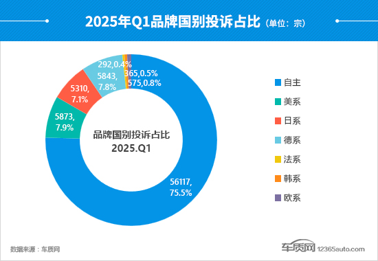 本季度,除自主品牌投诉量环比大幅上涨以外,其余各国别品牌投诉量环比均出现不同程度的下降,法系品牌在其中降幅最大,较上季度下降27.4%。降幅最小的是欧系品牌,投诉量与2024年四季度相差无几。