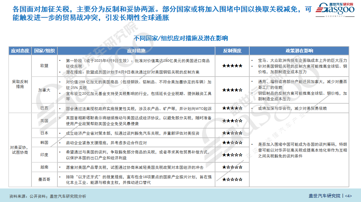 除了以上国家采取了直接反制措施,英国、日本、韩国、印度、越南和墨西哥等国家则对美国妥协,倾向于通过谈判方式争取关税豁免。日本政府已成立经济产业省对策本部,致力于通过外交途径争取汽车关税的豁免;韩国政府启动了针对受影响企业的紧急支援计划,并考虑通过多边合作机制应对挑战;印度和越南等国则期望通过双边谈判争取部分关税豁免或获得贸易补偿。墨西哥政府则推出了国家产业振兴计划,力图通过推动进口替代来减轻关税政策的影响。